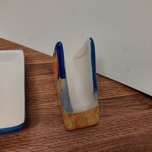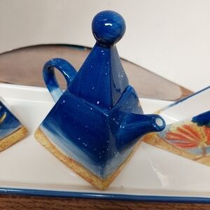 Vintage 90s Hi-Lux Japan Hand-painted Triangular Floral Teapot & Accessories. Porcelain. Collectible. Rare. Includes salt and pepper shakers and napkin holder with rectangular serving tray. Glazed cobalt blue with vibrant orange flower. Contemporary. Whimsical.