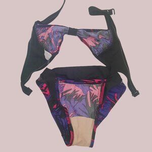 Vintage 90s High Cut Bikini Set Size XS Hot Pink Purple Black 2 Piece Halter