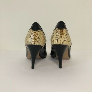 MATERIAL: Faux Patent Leather and Faux Snakeskin. Black and Cream / Tan colours.