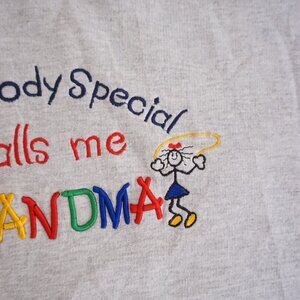 This rare Jerzees sweater showcases a classic crewneck fit and sweet embroidered detailing, ideal for gifting or cherishing as a vintage keepsake. The timeless gray hue and playful grandma theme make it a delightful addition to any wardrobe.