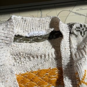 Vintage 90s striped knit button up sweater vest. Very nice vintage condition, light piling. Tag with sizing, maker and material has been cut. Would say it's a cotton acrylic blend, fits as a medium. Measures 16.5" across shoulders, 18" pit to pit, 25" long.