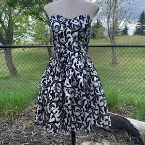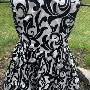 Vintage 90s LA Glo Silver Metallic Black Velvet Strapless Fit and Flare Dress