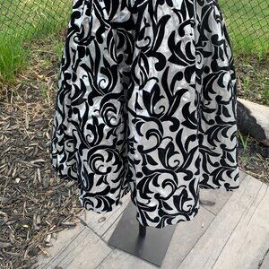 This vintage 90s strapless fit & flare dress in a silver metallic floral graphic black velvet print fabric with a sweetheart neckline and zip closure is perfect for various occasions such as prom, homecoming, travel, weddings, parties, casual outings, formal events, and workwear. The dress features a backless design, empire waist, upper side boning, and a sleeveless style with a goth dark fairy character theme. With a silver glitter accents and a floral pattern, this lightweight and lined dress is sure to make a statement, whether for Christmas, a princess-themed event, or a punk-inspired gathering. Made in the United States by the brand LA Glo, this dress is a unique blend of retro, 80s, and 90s styles.