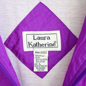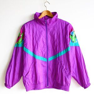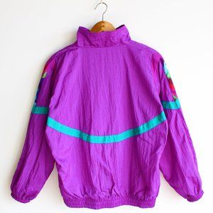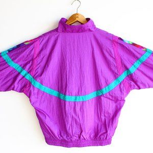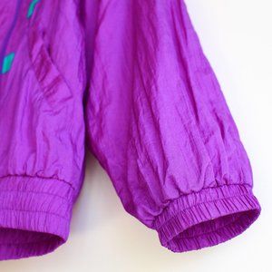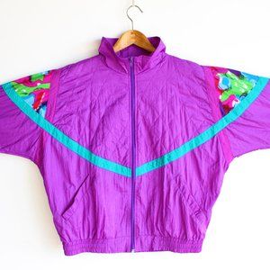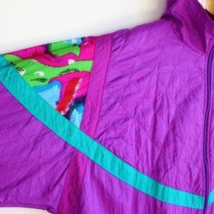 80's inspired, vintage Laura Katherine pink\purple-ish windbreaker jacket with quilted front and multi-colored paint pattern shoulders. With two side pockets, front zipper opening and elastic cuffs and waist. Size large. In exquisite condition. No stains, scratches, rips or holes.