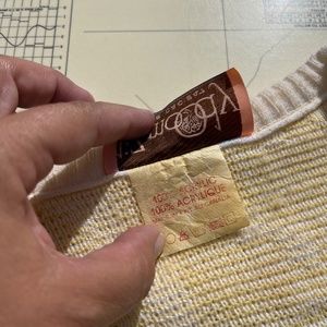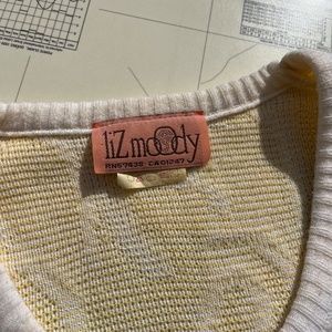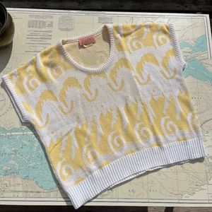 Vintage yellow and white knit top made by Liz Moody. Short sleeve, oversized with scoop neck and 'carousel' pattern. Tag with size has faded, I would say it fits like an oversized large. Measures 30" across shoulders (from sleeve hem to sleeve hem), 26" pit to pit, 23" long.