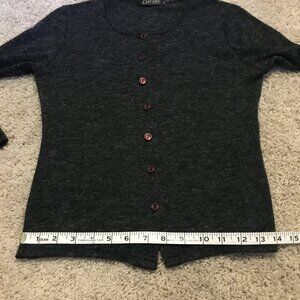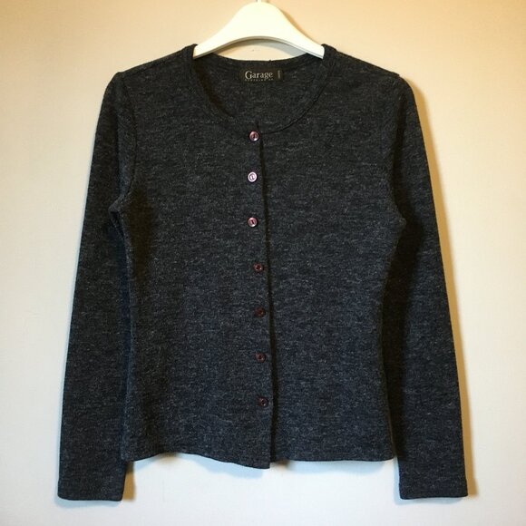 Very good 90s vintage condition, black (white and black to create a grey with just the tiniest note of blue) cardigan sweater with a delicate button down closure in slightly blue/purple tone buttons by Garage. Made in Canada, this sweater cardigan is just so sweet.