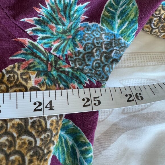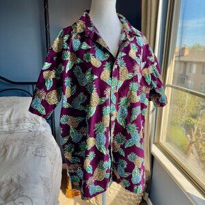 Vintage 1990s mens Aloha Hawaiian shirt, maroon with pineapple print, by Cooke Street. Size L, 100% cotton. Chest measures 25.25 inches laying flat, length from shoulder to hem is 27.5 inches. Cat friendly, nonsmoking home.