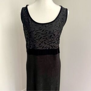 Vintage 90's Michel Antoni Velvet Burnout Sleeveless Maxi Sheath Dress Size 18. Velvet burnout floral leaf pattern on bust, velvet midi skirt. Scoop neck. Long length. Very Whimsigoth, witchy, goth vibes. Size 18. Excellent condition.