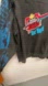 Stylish black denim jacket featuring a bold blue graphic design on the sleeves. Perfect for a trendy look.