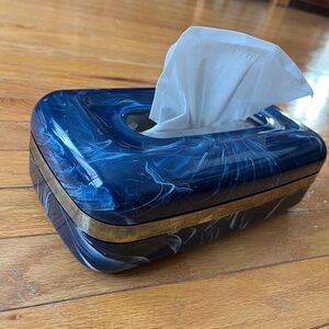 Vintage 90s Navy Blue Marbelled Plastic Tissue Box Cover. Gold stripe shows some wear to finish, see photos for details. Measures approx. 10.25" x 5.5" x 3.25".