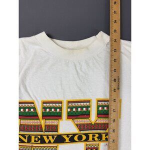 Vintage 90s New York NY Spell Out Art Logo Pattern Tribal White Shirt Short Heel
