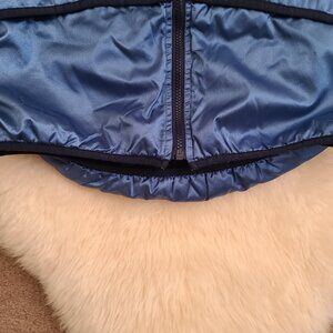 Vintage Nike Swoosh vest is a perfect addition to any 90s inspired outfit. The outer shell is made of nylon with polyester lining and features a blue color with Nike's iconic logo as an accent. The vest is a size large and has a full zip closure with pockets for added convenience. This windbreaker style vest is a must-have for any Nike or 90s fashion lover.