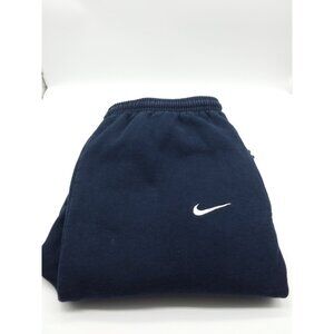1990's Nike Men's vintage navy track pants activewear jogging pants sweatpants size XL. In good condition. Some fading from being washed. Cuffed at ankles. 90% cotton and 10% polyester. Pockets on both sides. Made in Canada. Elastic waistband is perfect. Note: stitching on 1 of the ankle cuffs has opened and needs to be sewn up. This is on the seam. See last picture. Approximate measurements laying flat: Waist 15" unstretched. Inseam: 29". CA 05553. Vintage clothing often fits smaller. Machine wash and dry. From a non-smoking and pet free home.
