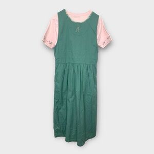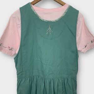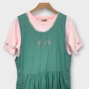 Vintage 90s Northern Reflections Pinafore Dress & Tee Set Green Pink Floral Embroidery Sz S