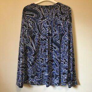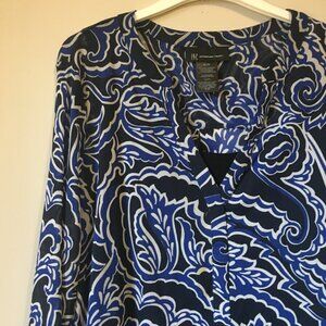 Very good preowned vintage condition button up dress shirt, from the 90s I believe, by INC International Concepts. This shirt is absolutely awesome. Pattern is a seamless fusion of paisley shapes and clouds in black, indigo and white. Super cool and a true 90s piece that is perfect for clubbing or just dressing up any outfit. It once included a camisole, but since has gone missing. I am including a very nice black tank by Canadian company Initiative as a replacement. I think it's even better because it will cover bra straps, though it is a shame that I can't find the original cami. If I do, I will update the listing.