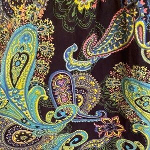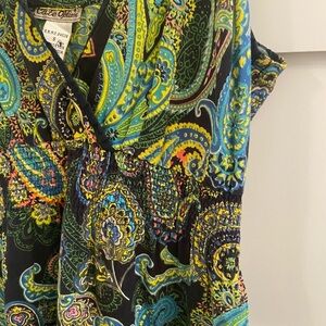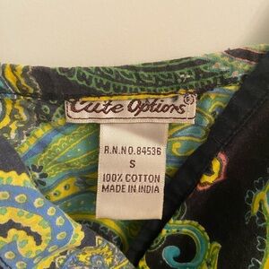 Vibrant vintage mini dress with a colourful paisley pattern. Features a mix of green, blue, and yellow colors. Smocked waist under bust design.