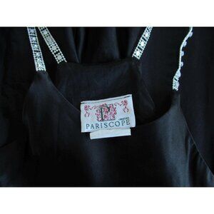 A 90s vintage Pariscope black slip dress with silver crystal straps, a halter neck style, 52% acetone, and 48% rayon, very flattering fit and hugs the right spots.