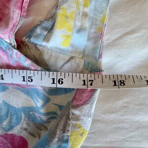 Vintage 1990s pastel floral sundress. No size, fits like a M. Waist measurement while flat: 34 inches max, but the attached belt will tie it to your waist size. Bust measures 17.5 inches flat, can stretch more due to smocking in back, waist measures 15.5 inches flat, length from shoulder to hem is 41.75 inches. Purchased at a small vintage shop in old Antibes, France. A few flaws: bottom left ruching is out but I didn’t notice it while wearing until going over it now! Some stitches could be tightened around the waist as well. Cat friendly, nonsmoking home.