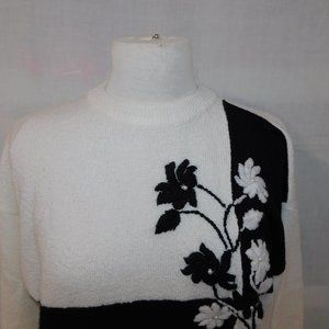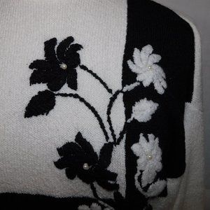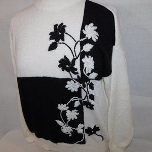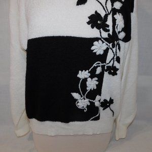 Vintage 90s Perspective Womens L Black White Embroidered Floral Sweater