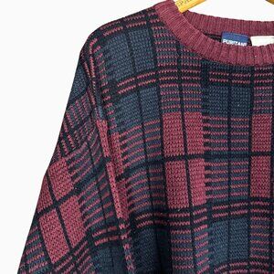 This vintage 90s Puritan sweater features a bold plaid knit in deep burgundy and black tones, made from 100% acrylic for a warm yet breathable feel. The crewneck cut and drop shoulder fit give it that classic oversized grandpa sweater vibe, perfect for layering or styling solo with denim or slacks. Made in Korea, this piece is both timeless and collectible.