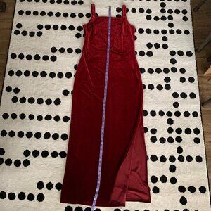 Vintage 90s Red Velvet Maxi Slip Dress Square Neck Glitter Side Slit Long Gown