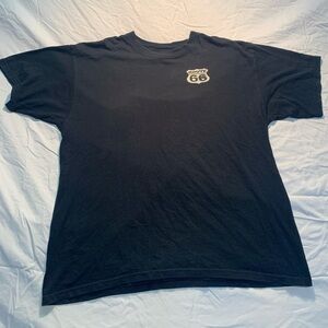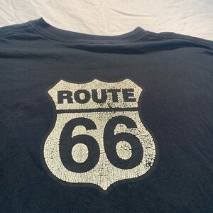Vintage 90s Gildan Route 66 t shirt. Does have small hole in right armpit. Embrace a classic look with the Route 66 Black Short Sleeve Tee, featuring a solid black hue and a comfortable crew neck design. This tee is crafted from soft cotton material, ensuring a relaxed fit for everyday wear. The subtle logo on the chest adds a touch of brand identity to this versatile piece.