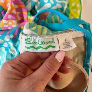 Vintage 90s Seawaves One Piece Swimsuit in great pre worn condition. Flattering wrap front with side pleats. Built in bra cups. Lilly Pulitzer pattern vibes. Please see all photos.