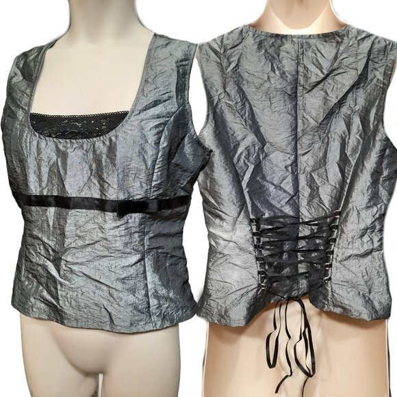 Vintage 90s Sleeveless Corset Top Juniors 13 Silver Black Trim Bow Lace Up