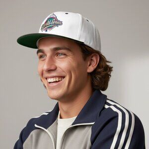 The hat is a timeless two-tone design with a crisp white crown and a contrasting black flat bill. The front panel showcases the intricately embroidered "1998 World Series" logo, with a stylized '8' that gives it a unique, nostalgic charm.