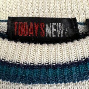 Step into effortless 90s nostalgia with this bold vintage striped sweater from Today’s News. Made in Taiwan and crafted from 100% acrylic, this lightweight yet cozy pullover features alternating deep teal blue, navy, and cream stripes in a textured knit—perfect for layering on breezy coastal mornings or crisp fall strolls.