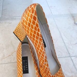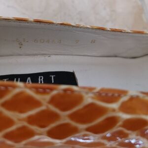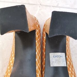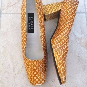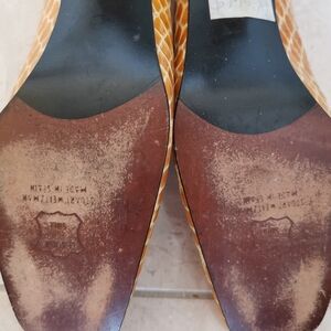 Vintage Stuart Weitzman yellow leather shoes from the 1990s. These shoes are in excellent, nearly unworn condition, with perfect heel bottoms. They still have the Eaton's sticker on the bottom (Eaton's closed in 1999). There is a small mark on the inner side of the right shoe, as shown in photos. Very comfortable.