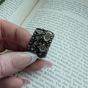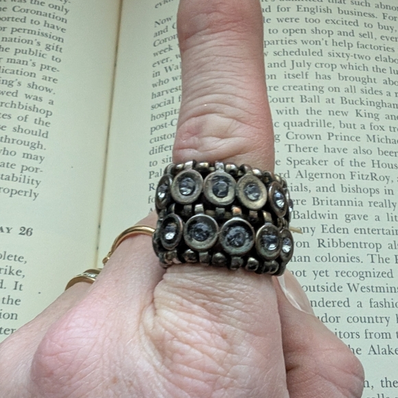 Elegant bronze ring featuring clear stones. Perfect for adding a touch of vintage charm.