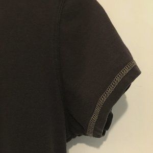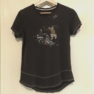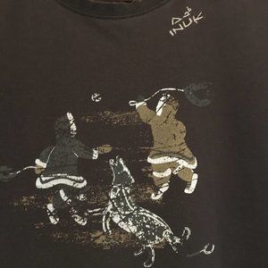 Good preowned vintage condition, brown, cotton, scoop hem t-shirt featuring two Inuit people and a husky dog, titled 'Inuk' for The Beaver Post, Canada. There's some nice stitching along the sleeve hems as well as the bottom scoop hem. There is some washing wear throughout, but nothing too notable.
