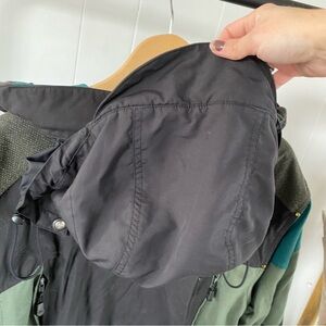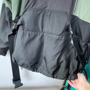 This jacket is so cool! Vintage The North Face Steep Tech Scot Schmidt ski jacket. This is an older version of the Apogee. Hideaway hood. Partial zipper and full zipper on the front. Buckle belt which is held in place by snap tabs. Multiple zippered pockets. Zipped underarm vents. The text has worn off the care/material tag. There’s a hole on the inner collar (i am pointing it out in one photo). Has wear, as it’s an older piece, but it’s still got tons of life in it. I washed it, but didn’t spot clean. Can’t see the size on the tag. Please check measurements. Fits like men’s medium.