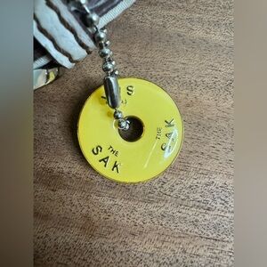 Ivory in colour with yellow and silver hardware, fun floral lining. Inside has a zipper pocket, 2 slip pockets and 2 pen holders. Back has a large pocket with button closure.