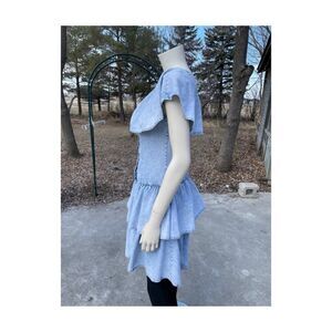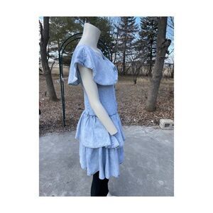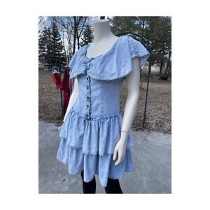 Metal button-up closure. Sleeveless. The circle collar gives the appearance of capped sleeves. Fitted waist and Double tiered skirt. Light wash denim has organic fade/wash wear. No stains, holes or tears. Pet and smoke-free studio.