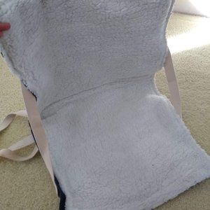 sturdy wood, twill strapping and canvas, with faux sheepskin cover