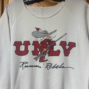 Cozy white sweatshirt featuring UNLV Runnin' Rebels graphic. Collar was removed for that open neck look, great for wearing a tank underneath. No tag, fits like a Men's Large. In excellent used condition, no issues.