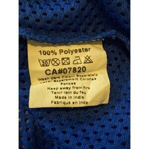 This vintage Umbro jersey top features a classic fit with a pullover closure. It is sleeveless and made of 100% polyester material with perforated features, making it suitable for activewear and casual occasions during summer, fall, or spring seasons. The blue color adds to the 90s sports theme with the Umbro logo on the front, making it a great addition to any collection. This item is machine washable for easy garment care and comes in size L for regular size teens. Made in India, this tank style jersey top is not personalized or handmade.