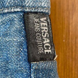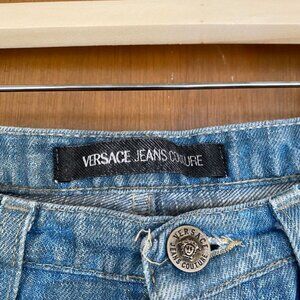 Rare 90's Versace cloudy sky denims, tight around the butt, mid-rise, for someone 5'6 to 5'10, it is 26 W and 26 Long, please refer to photos for authenticity