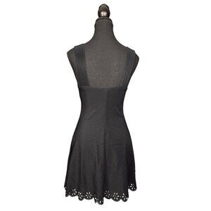 whimsigoth black mini dress, witchy gothic summer dress, stretchy sleeveless skater dress, floral cutout hem goth dress, romantic dark academia style, sleeveless witch aesthetic dress, flattering stretch fit party dress, black eyelet hem mini dress, vintage inspired goth clothing, witchy fairycore little black dress, gothic whimsical cocktail dress, sleeveless flattering fit witch dress, alternative fashion mini dress