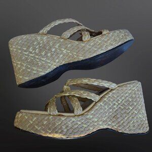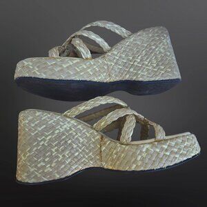 Vintage 90s Y2K Beige Chunky Platform Wedge Sandals Heels Size 10 Raffia Woven
