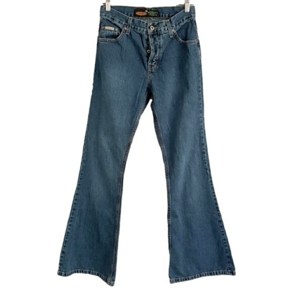 It's the 90s/Y2K does the 70s with these high-rise, five-pocket style, button fly, flared leg jeans by Bluenotes Groovy Wear. Made in Canada out of 100% cotton, so there's no stretch.