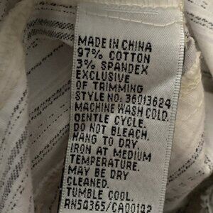 Vintage 90s Y2K Nygard Collection button up blouse from Nygard. White with black pinstripes and floral embroidered pattern on the front and back. Lightweight stretch cotton blend, and raw, frayed seams and edges give this shirt a distressed look. Wear it buttoned up, layered over a tank, or tied at the waist for an effortless vintage vibe.