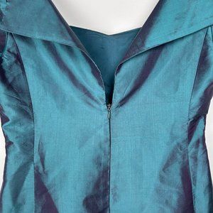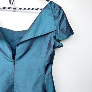 A tailored feminine bodice in teal and purple iridescent taffeta featuring a square sweetheart neckline, princess seams, cap sleeves, and a low, fold-over back with an invisible zipper closure.