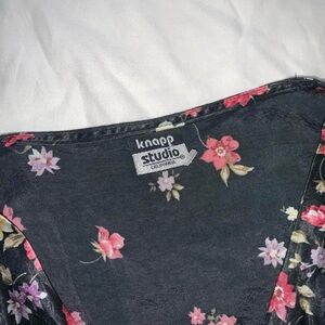 Adorable vintage-inspired satin mini dress by Knapp Studio, likely from the late ’90s to early 2000s. Features a black base with an allover floral print in red, pink, yellow, and lavender. Deep V-neck, side ties for a cinched waist, and a flattering A-line silhouette. Slight sheen to fabric, smooth and satiny