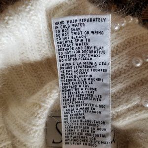Material silk, nylon, angora (rabbit), really soft, fluffy, not itchy, warm, hand embroidery beads. Season most of the year, holiday season, condition really soft, not itchy, little used, hardly worn, well cared for. Washing info. hand wash, (spot wash) cold water, dry flat.