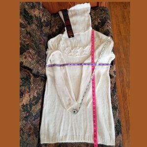 Size women's S, M, long. Width pit to pit, inches 19, length inches 30.25, colour cream with pearl beading on cowl/turtle neck. Wear with pants or skirts, dresses up outfits. Has been worn for special occasions only with long, flowing black silk skirt; fuller style black leather skirt.