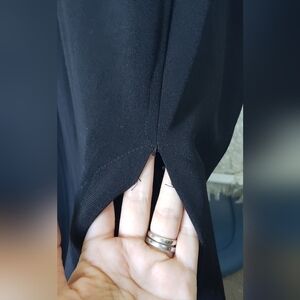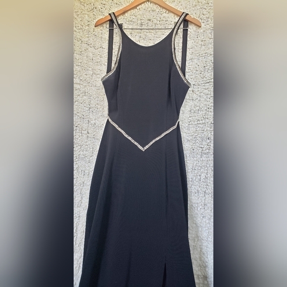 Vintage 90s black rhinestone prom style maxi dress 12 large. has a slit at leg. 1 pinhole, pictured in photos. zipper closure. straps can criss cross or be "straight" to create an open back.