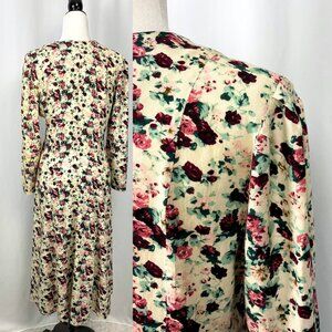 Vintage 90s cream floral rose grunge button up midi fit and flare dress medium